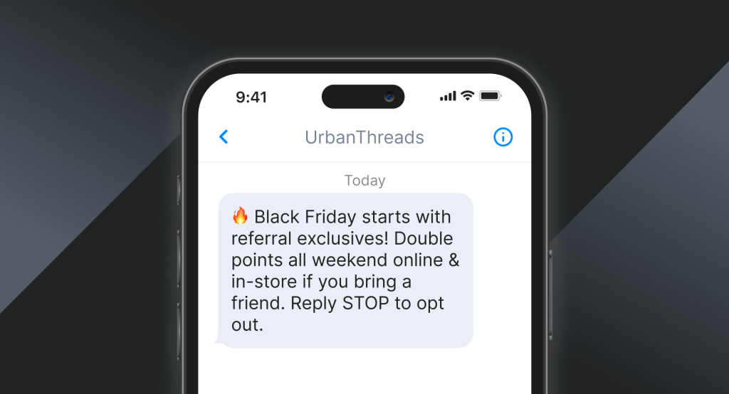 💸 Share the savings! Refer a friend during Black Friday and you’ll both get [X]% off your next order. Reply STOP to opt out.