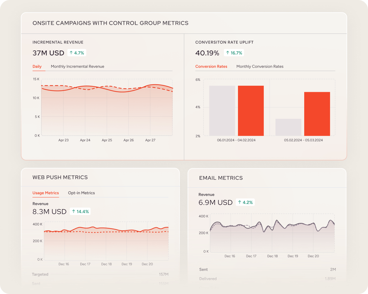 Insider One aggregates performance metrics from email, web, mobile, SMS, and push notifications in a single, real-time interface. This means you can compare campaign performance side-by-side without switching tools or exporting data.