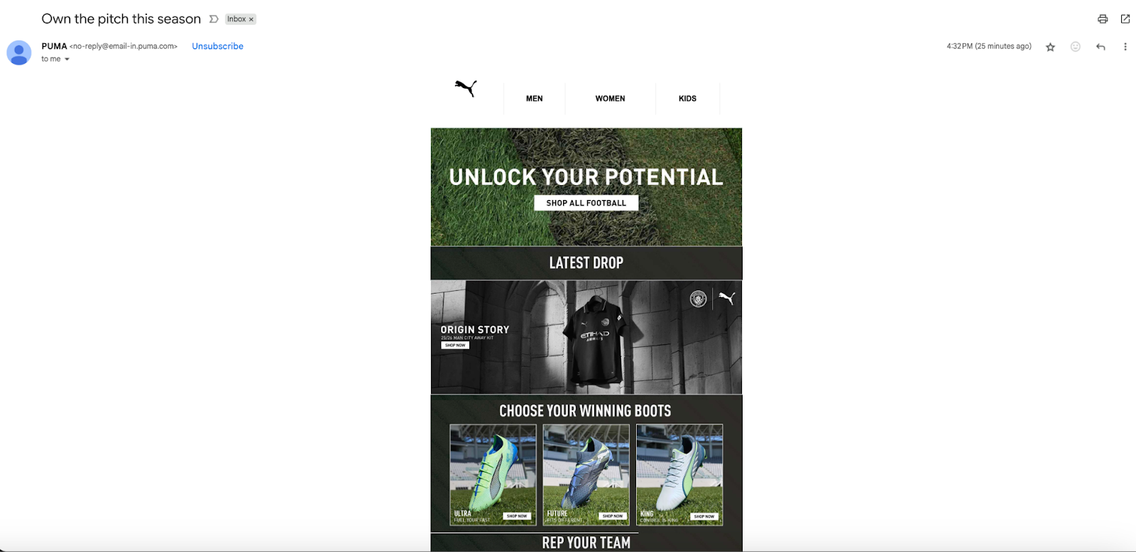 PUMA triggers its football boot emails at the start of pre-season, when player replacement and upgrade intent naturally spike. Instead of sending a generic new-arrivals campaign, the automation fires around key season moments like league restarts and training ramps, promoting product packs aligned to player needs like speed, control, and creativity.