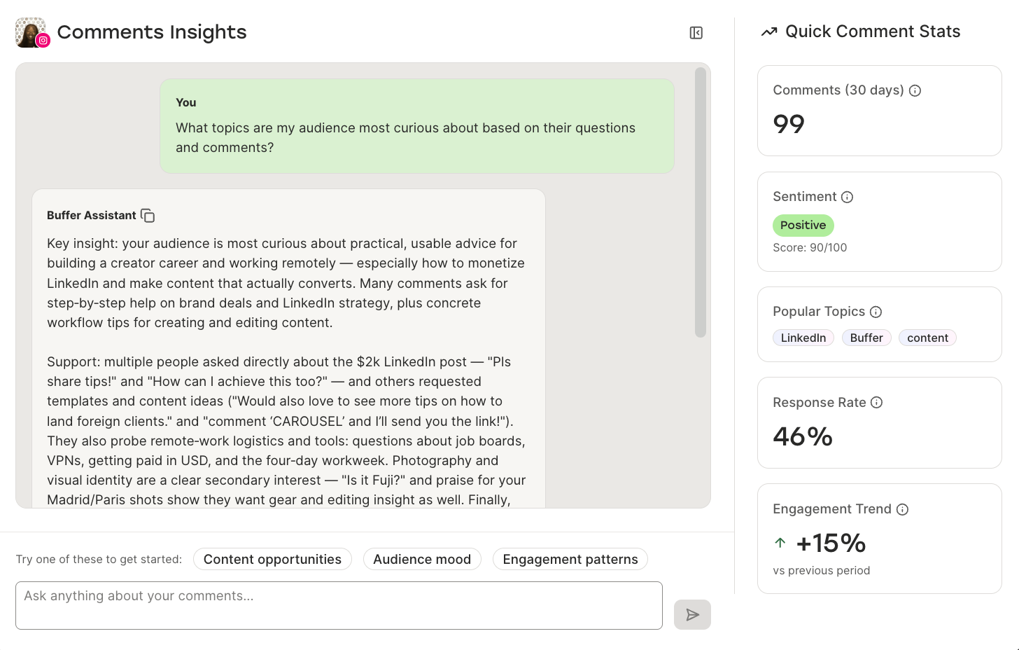 💡 Pro tip: You don’t need expensive social listening software to get started. But if you’re already using Buffer, the Community feature includes AI-powered Insights that can surface comment themes and patterns across your channels — helping you spot what your audience cares about without manually reading every single reply. It’s a lightweight version of social listening built into your existing workflow, and it pairs well with the deeper, manual listening you’re doing in niche communities.