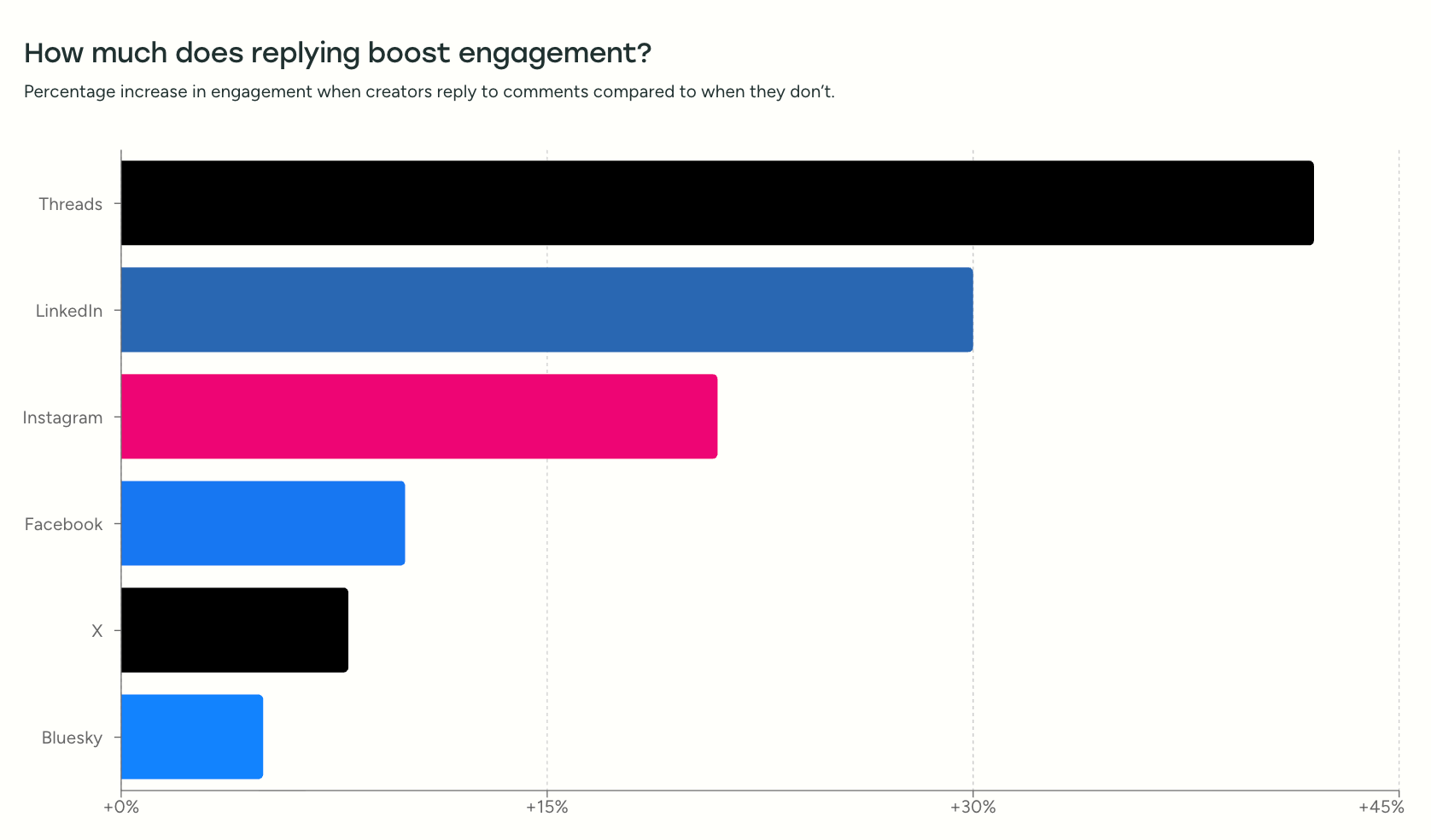 What’s interesting is where the effect is strongest. Threads and LinkedIn — the two platforms most explicitly built around conversation — showed the largest lifts. Their interfaces surface replies in ways most other platforms don’t. The effect is still meaningful on Instagram and Facebook, just smaller. And it’s weakest on X and Bluesky, where reply samples are smaller, and distribution is more unpredictable.