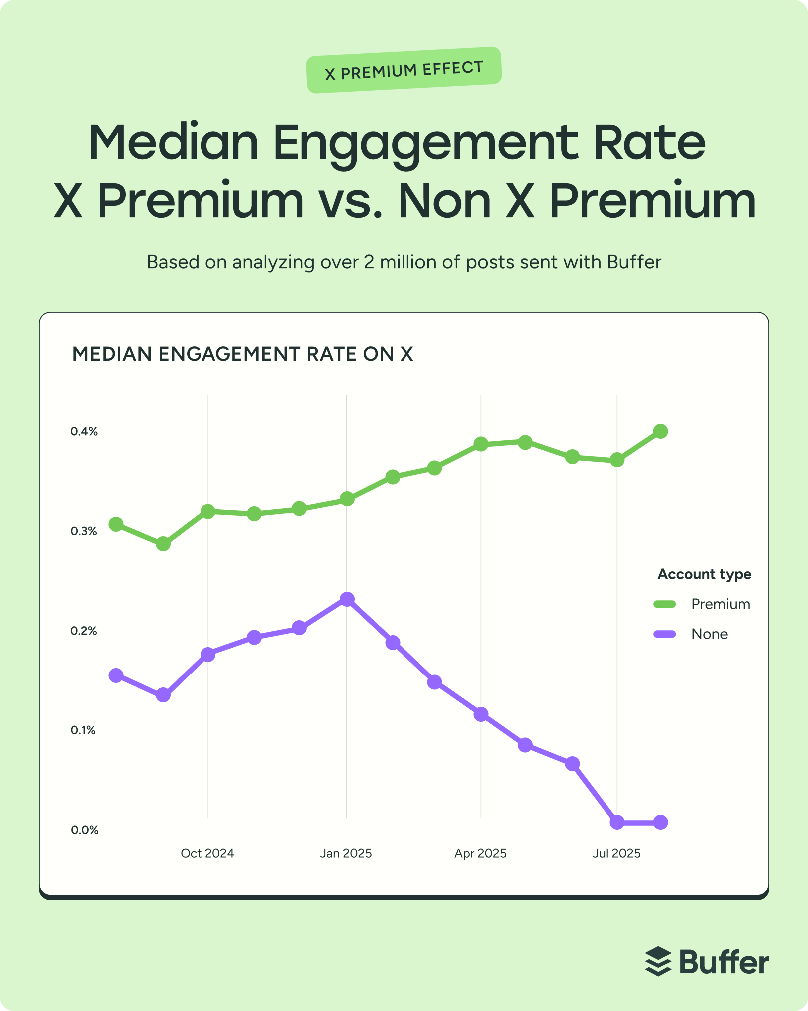 And then there’s X, where the Premium tier has introduced a structural divide. After January 2025, Premium and regular accounts diverged sharply on engagement — Premium rates rose while regular account rates fell. In the most recent months of our dataset, the median engagement rate for non-Premium accounts hit 0%.