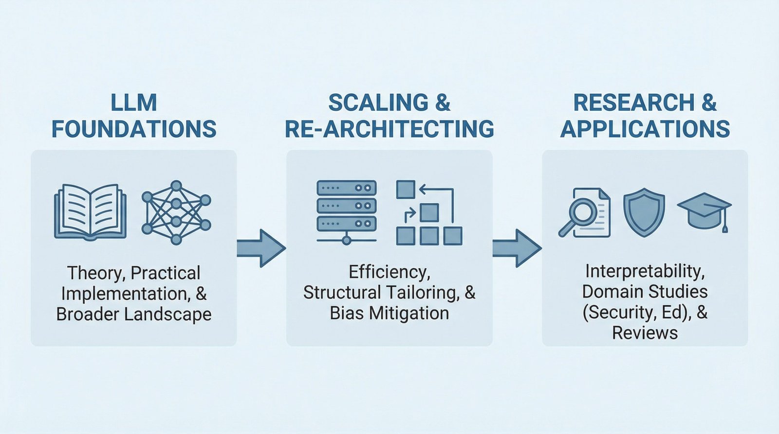 For beginners in LLMs, the natural starting point is to focus on the first block — that is, reading and acquiring the foundations of LLMs. Once you are familiar with these, depending on your preferences and needs, continue to either one of the other two blocks to deepen your knowledge.