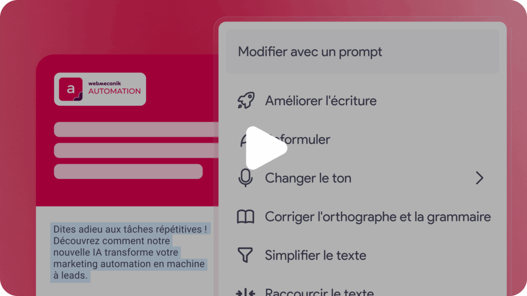 Chez Webmecanik, l’IA est pensée comme un assistant au service des marketeurs, et non comme un substitut. Vous gardez la main sur vos contenus en définissant le message et l’intention, tandis que l’IA vous aide à avancer plus vite lorsque vous bloquez sur une formulation.