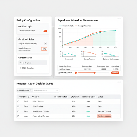 - Activation: Single-channel decisioning (start with email or web), holdout measurement, policy configuration