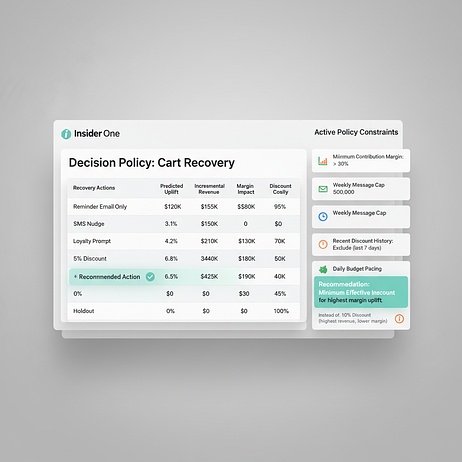 Without constraints, a decisioning engine simply gives everyone the biggest discount to maximize conversion rates. A proper policy defines the objective (like maximizing incremental revenue) and the allowed actions (discount tiers, channels) subject to specific limits.