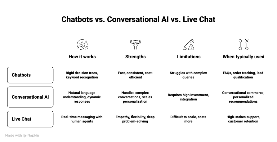 What is the difference between a chatbot, conversational AI, and live chat?