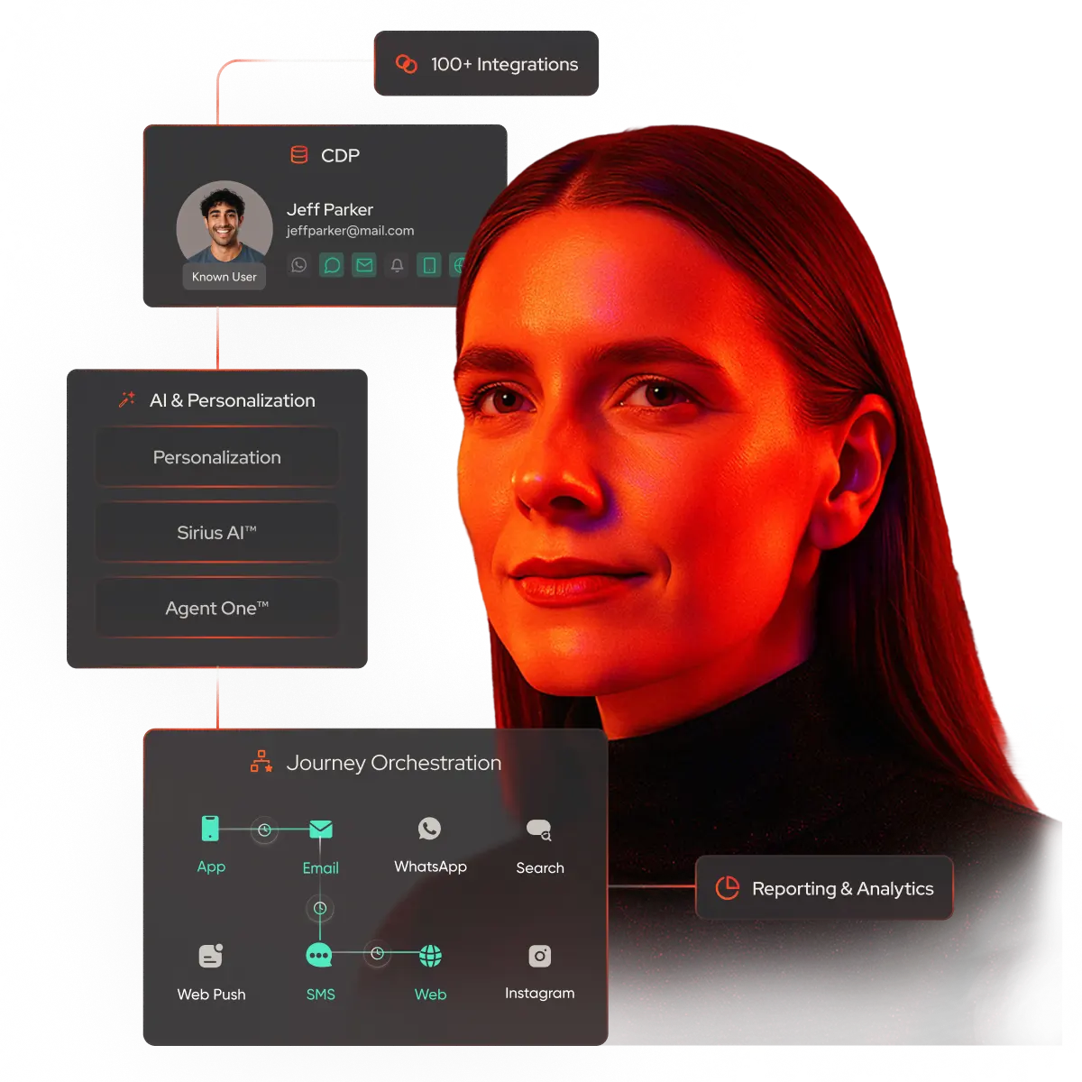 - 12+ Native Channels: Email, SMS, WhatsApp Business, RCS (Rich Communication Services), Web Push, App Push (iOS and Android), In-App Messages, InStories (mobile-first ephemeral content), On-Site Notifications, and more—all activated from a single orchestration layer without requiring separate vendor integrations