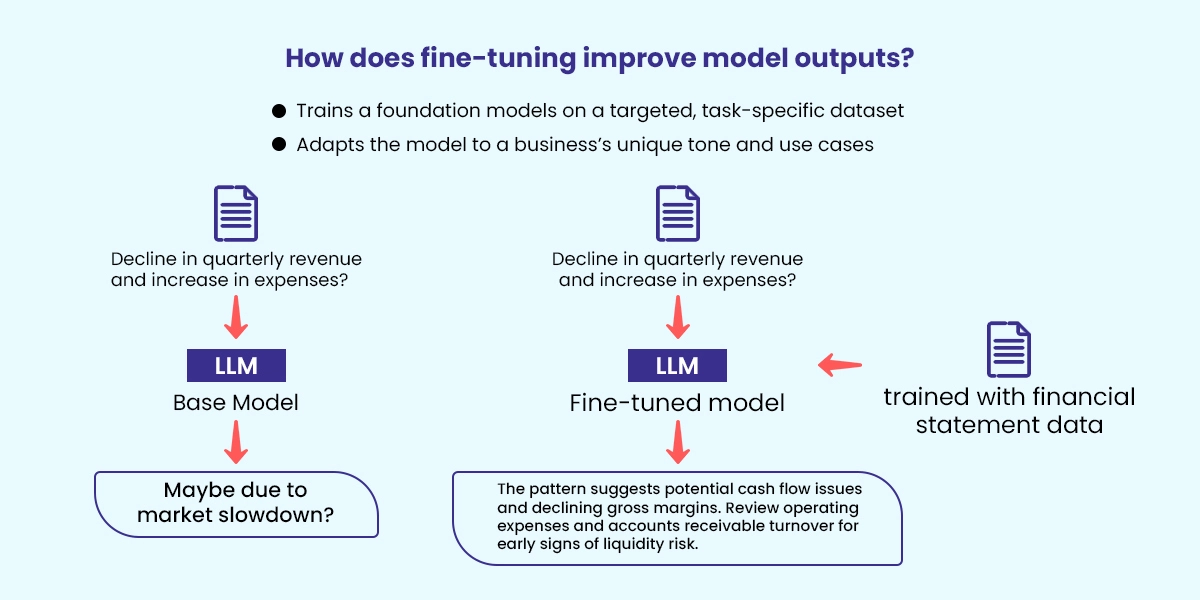 Fine-tuning leverages these raw linguistic capabilities, adapting a foundation model to a business’s unique tone and use cases by training on a smaller, task-specific dataset. This makes fine-tuned models well-suited for practical, real-world applications.