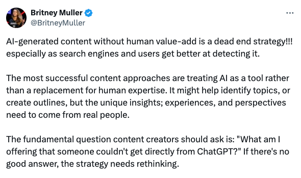 “AI-generated content without human value-add is a dead end strategy,” AI and SEO consultant Britney Muller posted on X earlier this year. “[E]specially as search engines and users get better at detecting it.”
