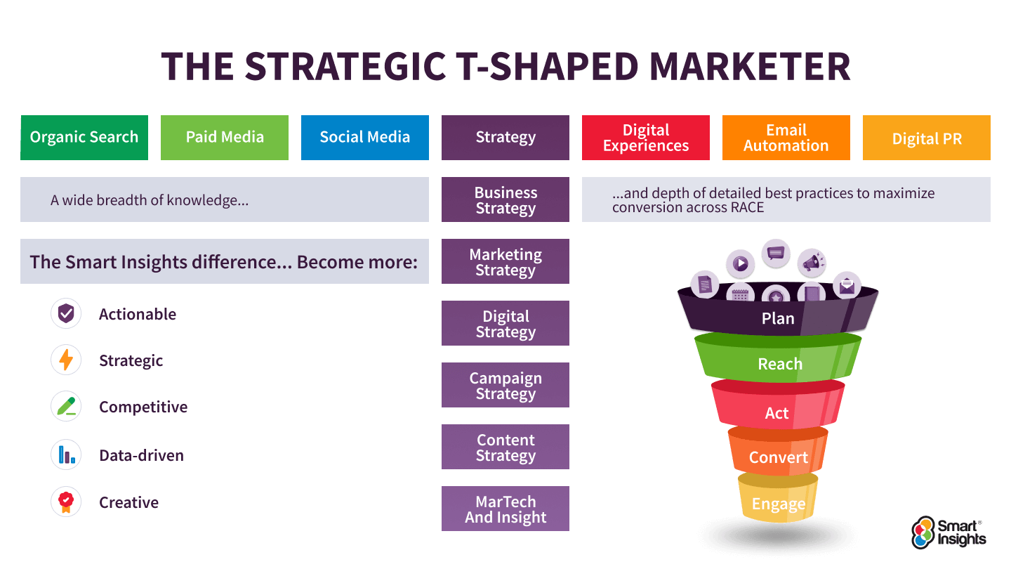 The Smart Insights learning approach is to help support your career development so that you can become a strategic T-Shaped marketer who has a wide breadth of knowledge of modern marketing channels and an in-depth knowledge of detailed best practices for effective use of these channels. But it goes beyond that, since employers are looking for a broader skill-set than digital media. They need self-starters who know how to create strategy and plans for the business and individual channels. Unlike most online learning, all our toolkits start with goals and strategy rather than diving straight into tactics.