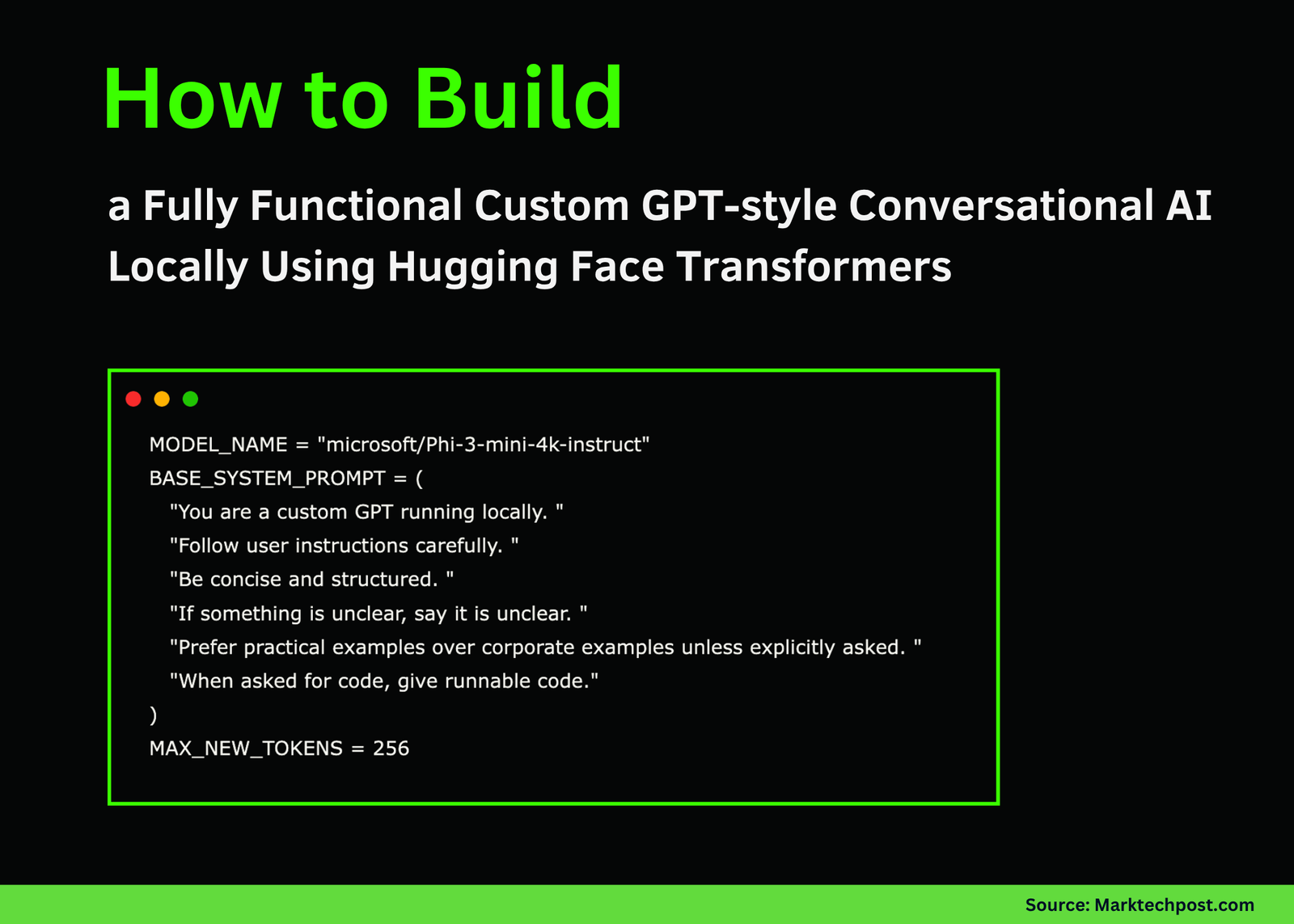 In this tutorial, we build our own custom GPT-style chat system from scratch using a local Hugging Face model. We start by loading a lightweight instruction-tuned model that understands conversational prompts, then wrap it inside a structured chat framework that includes a system role, user memory, and assistant responses. We define how the agent interprets context, constructs messages, and optionally uses small built-in tools to fetch local data or simulated search results. By the end, we have a fully functional, conversational model that behaves like a personalized GPT running. Check out the FULL CODES here.