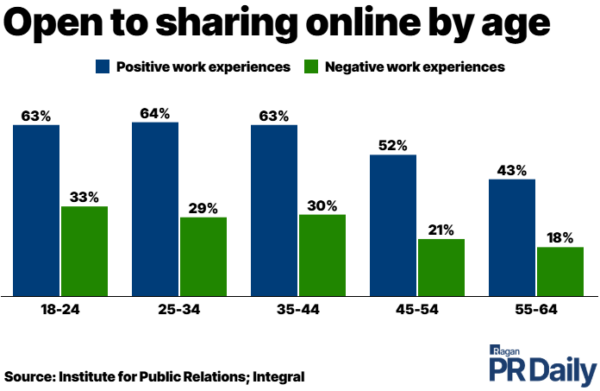 New research from the Institute for Public Relations and Integral, an employee experience agency, shows 63% of workers aged 18-24 are open to sharing positive work experiences on the web. Meanwhile, 33% show a willingness to post negative ones. In both cases, the inclination to either celebrate or criticize via the internet is stronger among younger employees than it is among older employees.