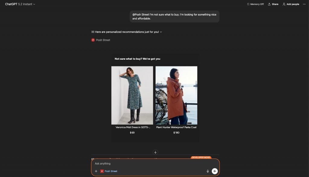 This creates a smoother path from conversational discovery to conversion, bridging AI interactions with commerce outcomes.