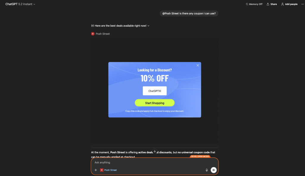Inside ChatGPT, Insider One enables brands to introduce offers and incentives naturally within the flow of conversation, triggered by what a user is actively asking. Promotional interactions feed back into the platform’s data layer, so brands understand how offers influence engagement and revenue across touchpoints.