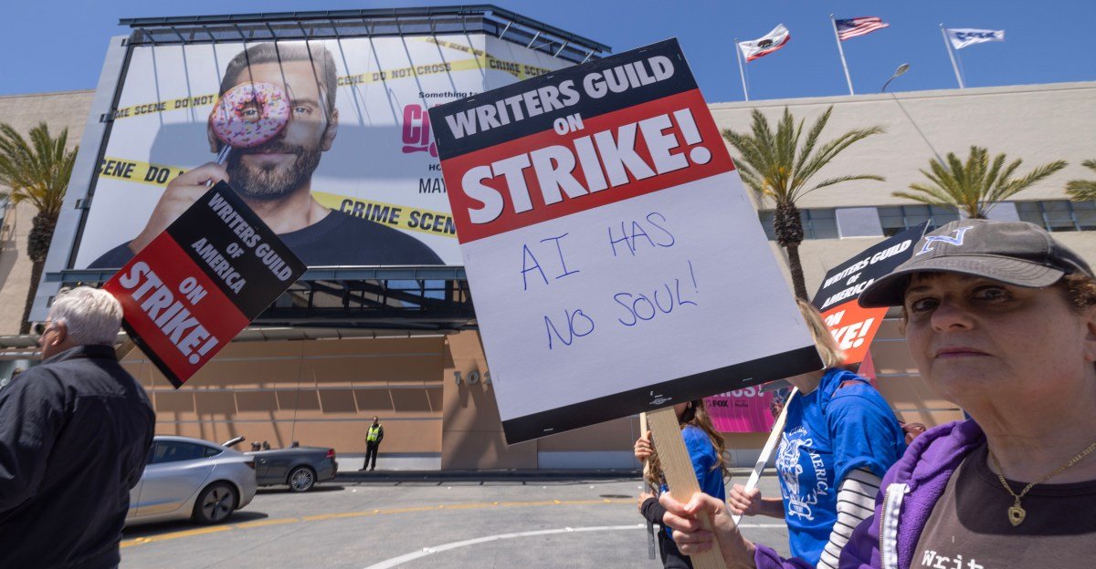 SAG-AFTRA members strike outside Paramount Studios on November 8, 2023, in Los Angeles.