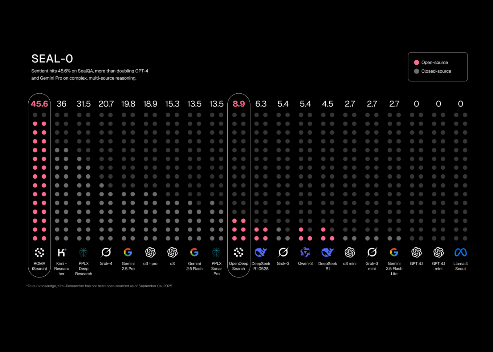 To validate the architecture, Sentient built ROMA Search, an internet search agent implemented on the ROMA scaffold (no domain-specific “deep research” heuristics claimed). On SEALQA (Seal-0)—a subset designed to stress multi-source reasoning—ROMA Search is reported at 45.6% accuracy, exceeding Kimi Researcher (36%) and Gemini 2.5 Pro (19.8%). The ROMA also reports state-of-the-art on FRAMES (multi-step reasoning) and near-SOTA on SimpleQA (factual retrieval). As with all vendor-published results, treat these as directional until independently reproduced, but they show the architecture is competitive across reasoning-heavy and fact-centric tasks.