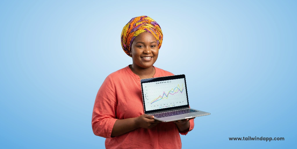 Smiling woman holding a laptop displaying upward-trending graphs, related to Tailwind Turbo Beta results.