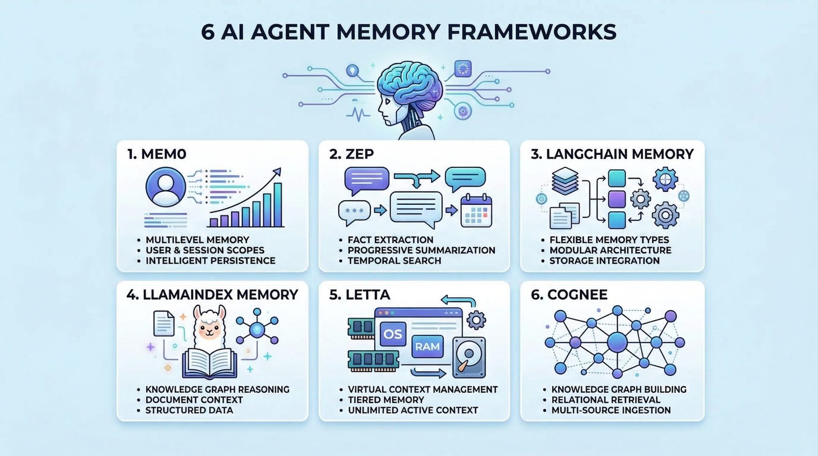 - Six frameworks for long-term memory, retrieval, and context management.