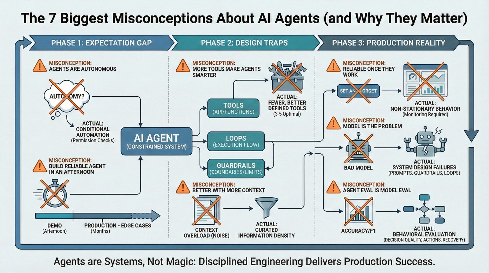 Here are the seven misconceptions that matter most, grouped by where they appear in the agent lifecycle: initial expectations, design decisions, and production operations.