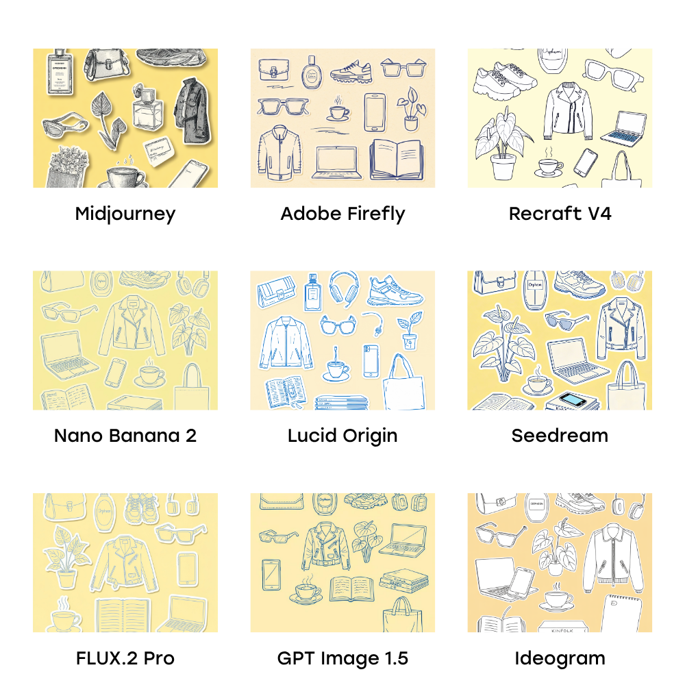 I tested nine AI image generation models across three prompts: a hand-drawn doodle sticker sheet, a styled product flat lay, and an embroidered typography graphic.