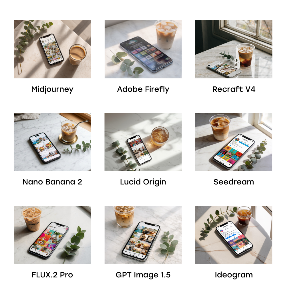 How it handled photorealism: The overall composition and photography feel were strong. The layout, the lighting, the general mood of the image landed well. But the details fell apart: the “iced coffee” had no ice (just an ambiguous glass of something), and the Instagram feed on the phone screen was warped beyond recognition. Midjourney builds a beautiful scene and then fumbles the specifics inside it.
