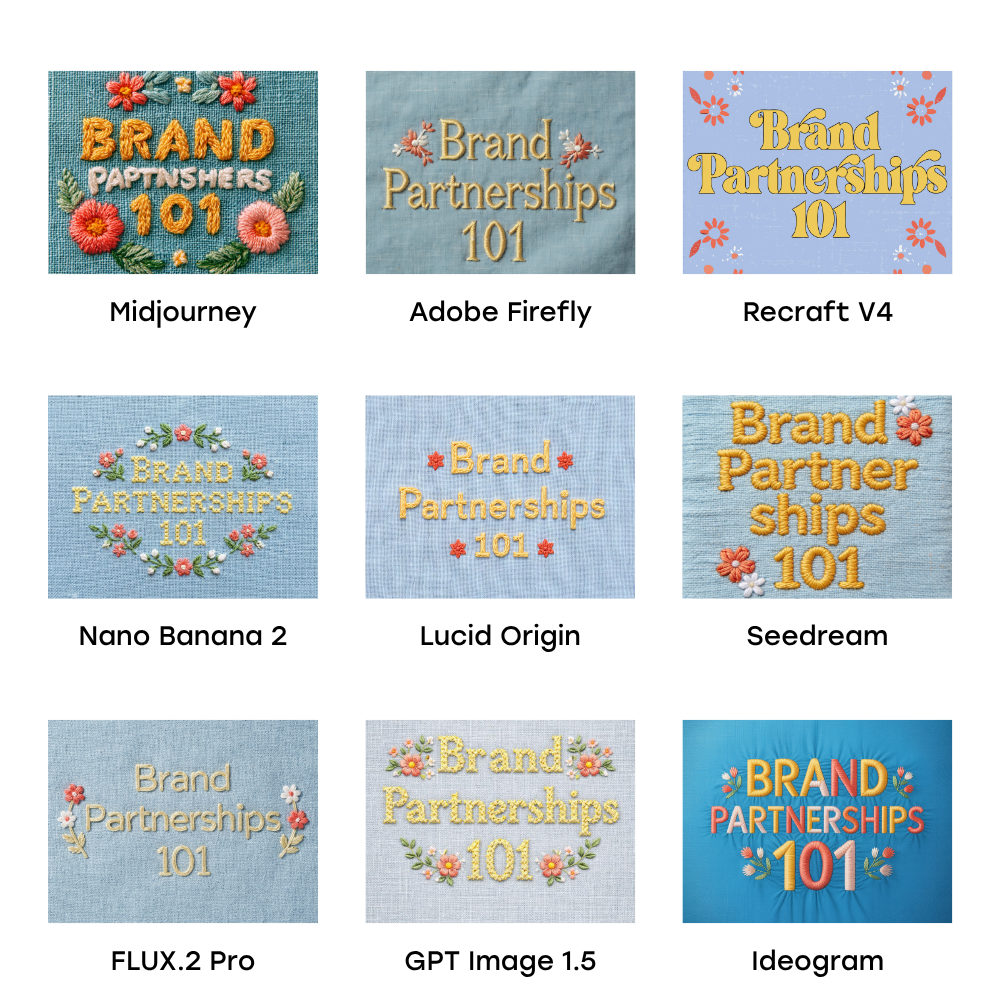 How it handled typography: This is where Midjourney hit a wall. It spelled “brand” correctly and got “101” right, but “partnerships” was garbled. The embroidery stitching itself looked genuinely handcrafted, maybe even the best texture of the bunch. But when your competitor tools are nailing the text on the first try, beautiful stitching on misspelled words doesn’t cut it.