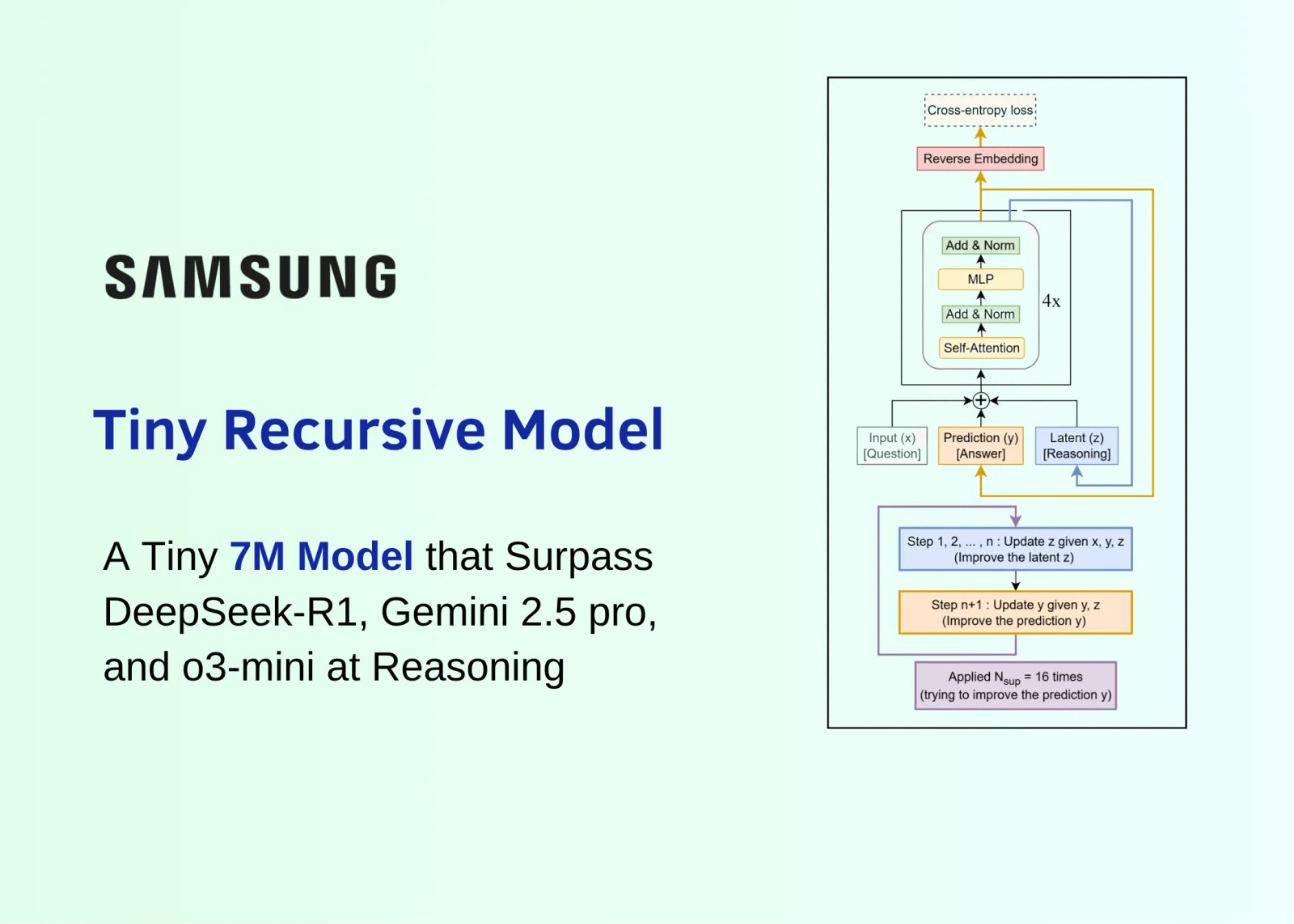 - Architecture: A ~7M-param, 2-layer recursive solver that alternates latent “think” updates 𝑧 ← 𝑓 ( 𝑥 , 𝑦 , 𝑧 ) z←f(x,y,z) and an “act” refinement 𝑦 ← 𝑔 ( 𝑦 , 𝑧 ) y←g(y,z), unrolled up to 16 steps with deep supervision; gradients are propagated through the full recursion (no fixed-point/IFT approximation).