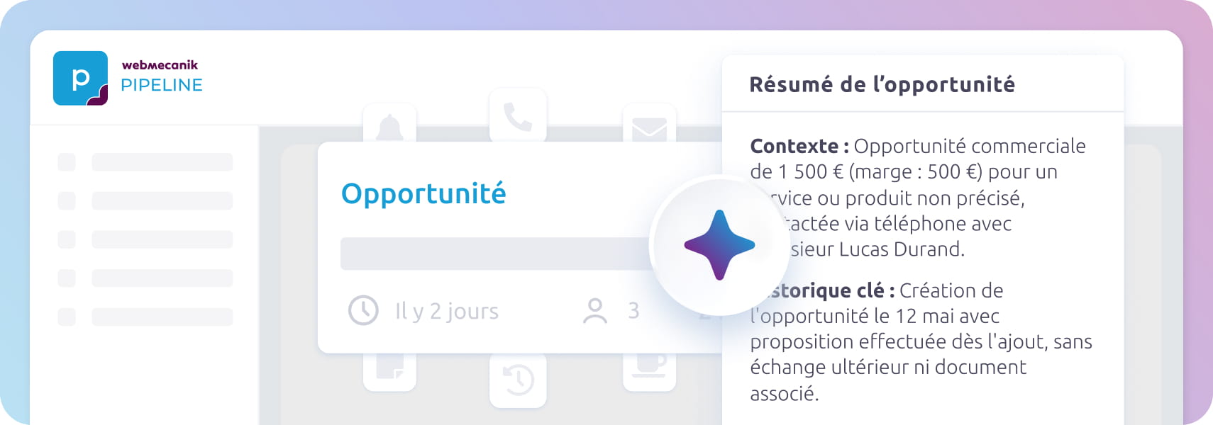Avec la première fonctionnalité IA de Webmecanik Pipeline, franchissez une nouvelle étape dans la gestion de vos opportunités commerciales en devenant plus efficace, plus réactif et mieux préparé à chaque interaction.