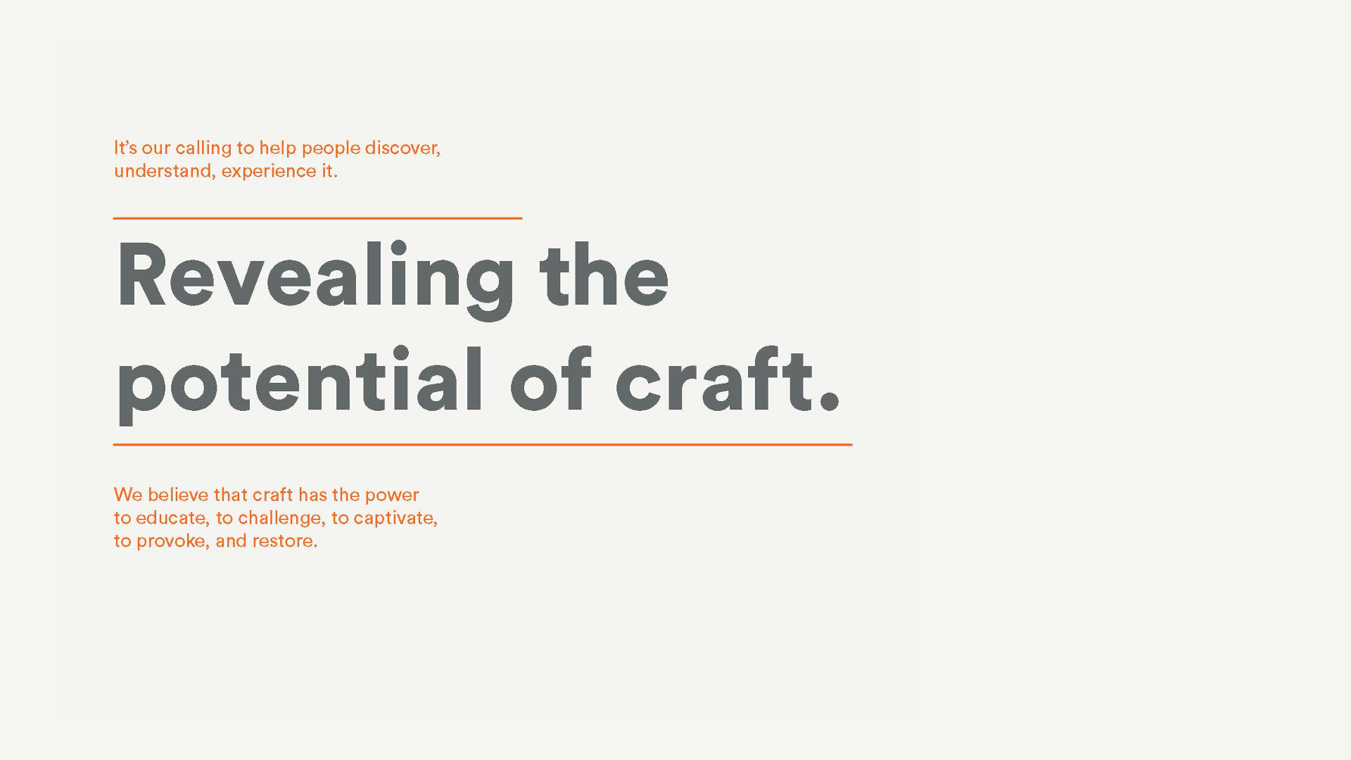 The challenge was to honor the history and brilliance of craft, but convey its power in a fresh way. We learned craft is all about the “how.” Material and method are more precious than the end art object. The final name needed to dial-up the idea of making and breathe new life into a time-honored practice. Our global naming team developed hundreds of names, everything from very subtle shifts to more inventive solutions with an intriguing edge. We explored a broad range of themes, styles, and tones, ensuring that each name served as an authentic articulation of the museum today and could grow with the museum over time.
