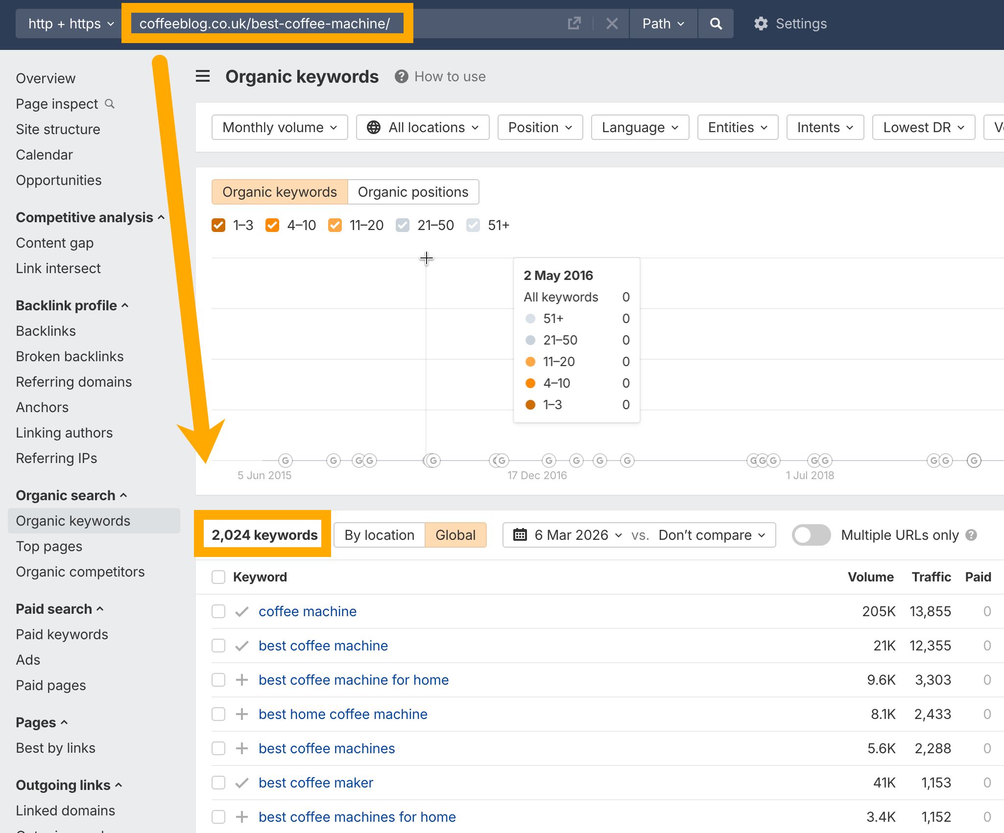 Site Explorer → Organic keywords report showing keywords for a competitor URL.
