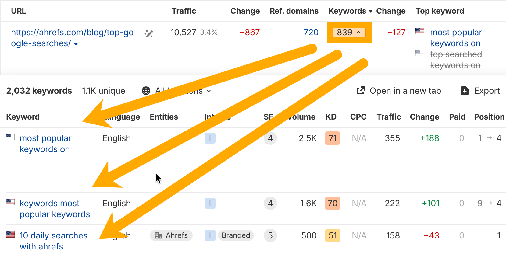 Here’s an Ahrefs article ranking for 839 related keywords.