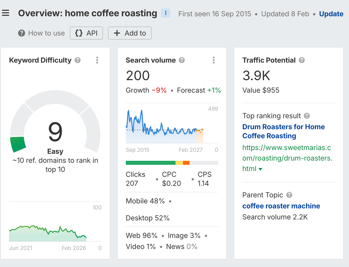 - “how to roast coffee beans” (1.9K volume, KD 2)